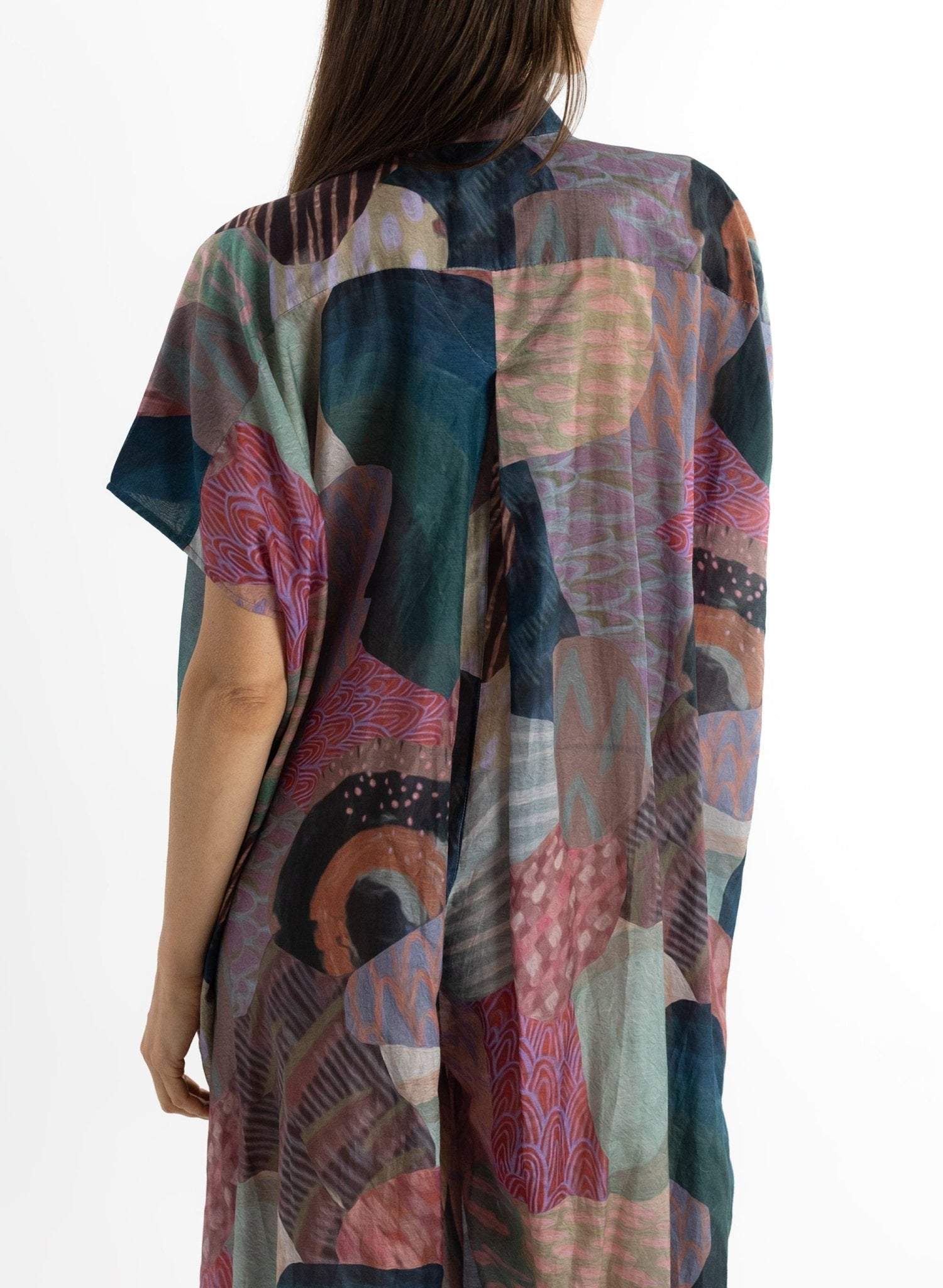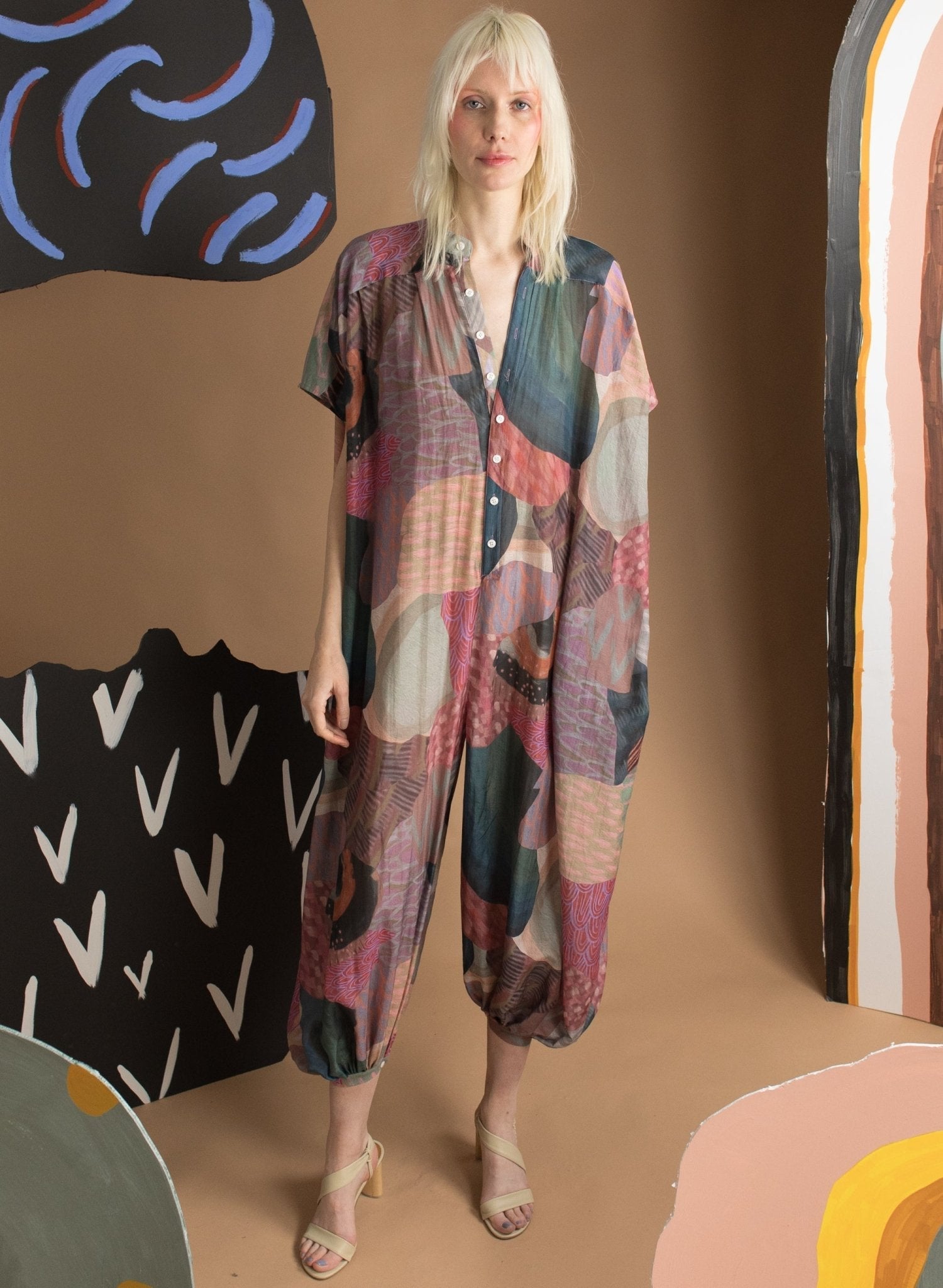 The Renegado Jumpsuit blends relaxed comfort with refined style. Featuring a Mandarin collar, front buttons, short sleeves, and wide legs with cuffed ankles, this lightweight jumpsuit is perfect for warm weather. The slightly sheer fabric and loose torso create an airy, easy-to-wear fit. Complete with side pockets for everyday practicality.