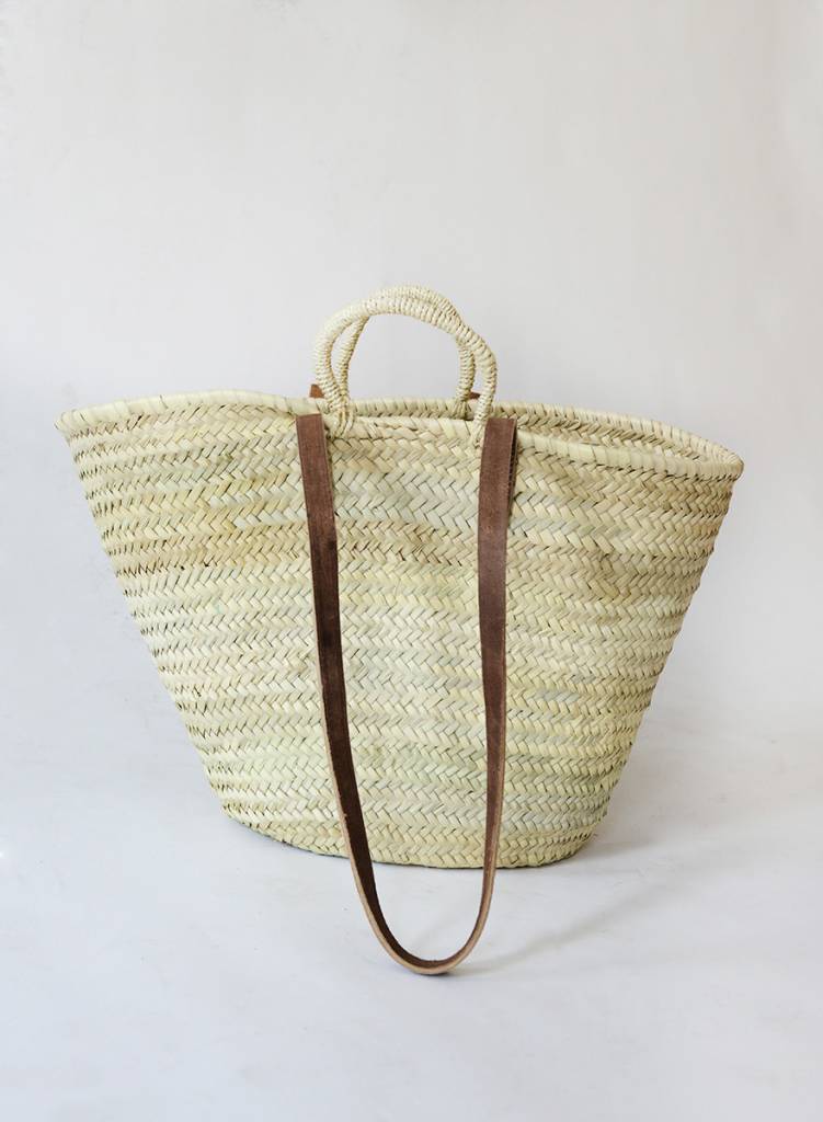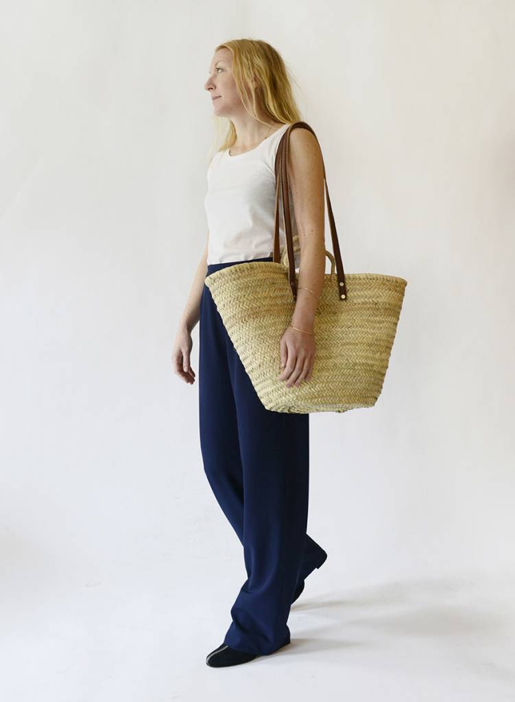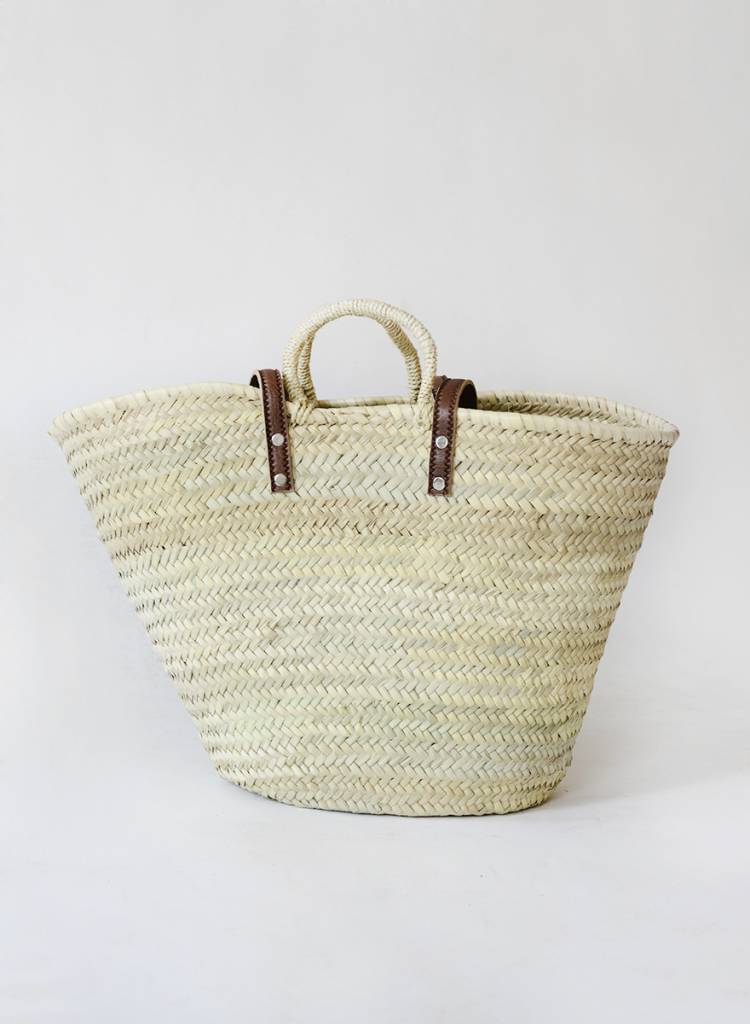 A handcrafted French market basket, the ultimate sustainable product made by farmers in Morocco from fallen palm fronds. Sturdy leather handles, and a lightweight yet strong body make it ideal for food shopping, a beach bag, or a weekender.