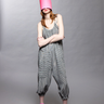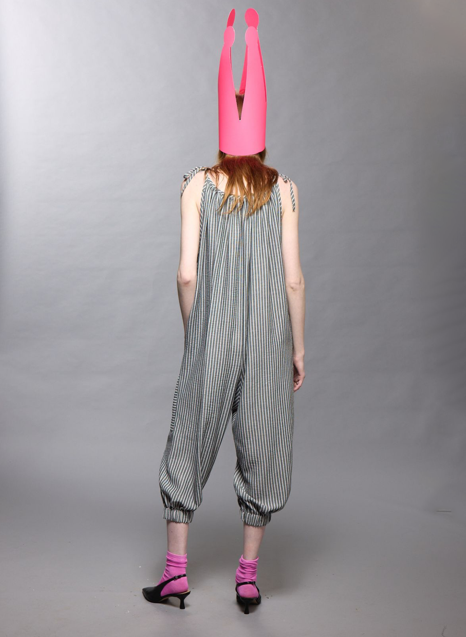 Cut from a lightweight, non-sheer striped polyester, this pull-on jumpsuit features adjustable tie shoulders and soft gathering at the front and back for an easy, flattering shape. The elastic cuffs create a relaxed bloomer silhouette that moves with you, while clean binding finishes keep the look intentional, not fussy.