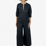 Feels a little Japanese with the flared sleeve and flared cropped leg. This jumpsuit is the perfect thing to wear when you don’t know what to wear—to the school concert, someone’s house for dinner on a Thursday, even in black to a funeral… anywhere a dress would seem appropriate. This jumpsuit feels a little less fussy. We love belting the slightly higher waist seam with our wrap belt to dress it up a bit; it also looks cute on its own with sneakers. This jumpsuit is amazing on pear shapes but truly great on everyone, which is why it’s one of our staples.