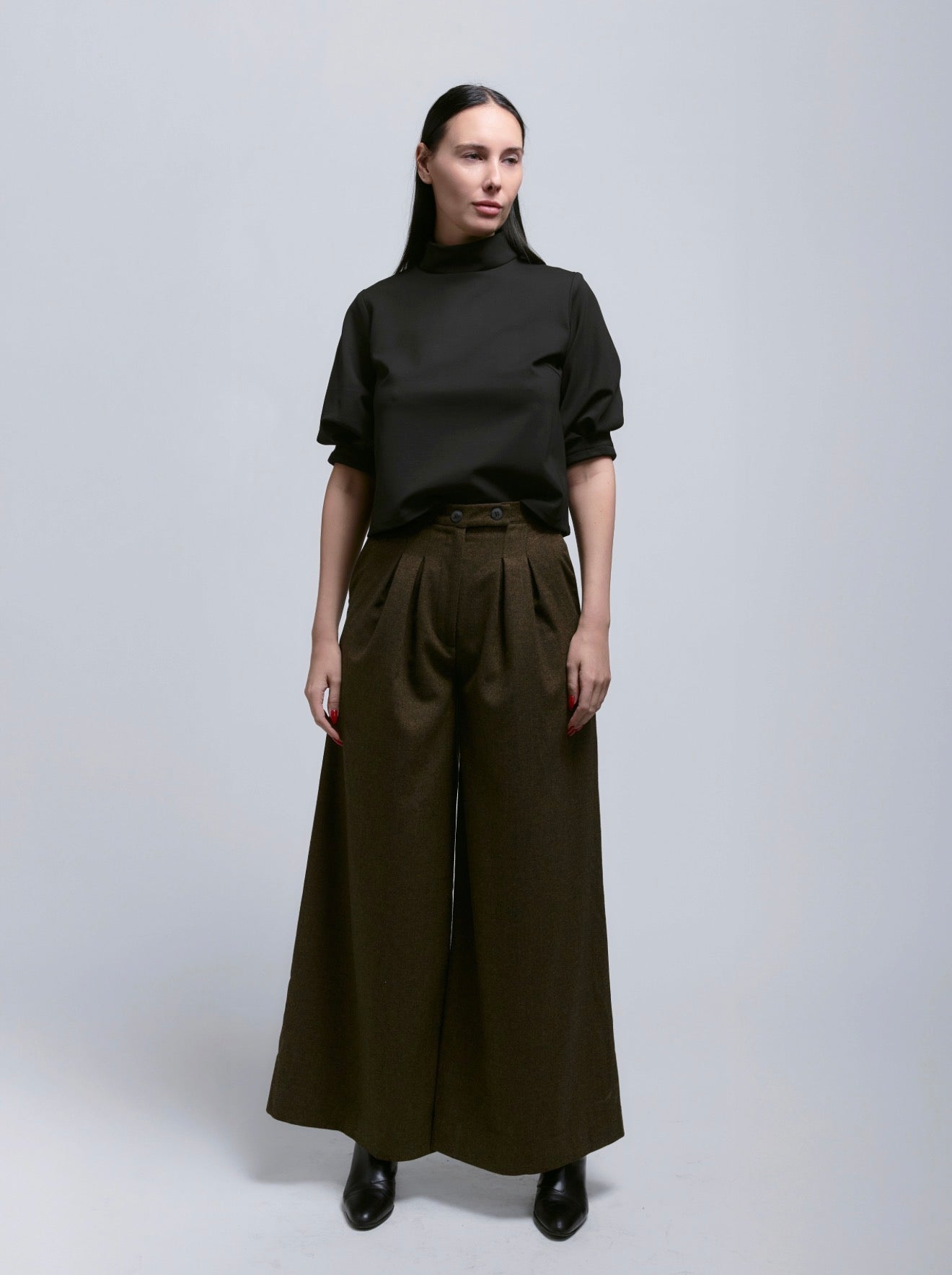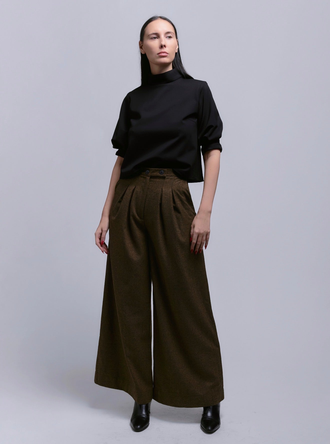 Dramatic pleated, fly-front trousers that move like a long skirt. Elegant and elongated, they’re perfect for taller silhouettes. Style them with delicate blouses, casual tees, or sleek turtlenecks for effortless sophistication.